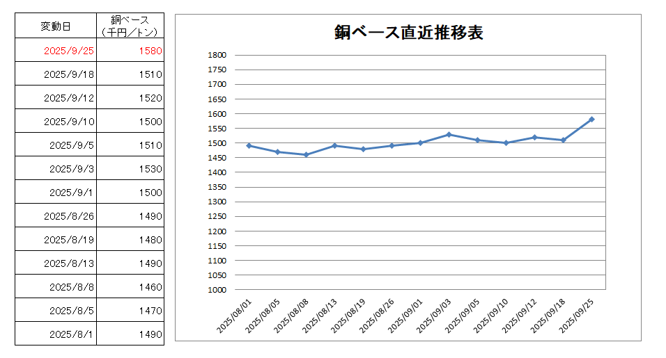 電設資材銅ベース 2025.09.25[ 電設資材銅ベース ] 1580千円/トン(7万円上げ) 9月25日(7万円上げ) 1510千円/トン(1万円下げ)[2025.09.18] 1570千円/トン(1万円下げ)[2025.10.01]