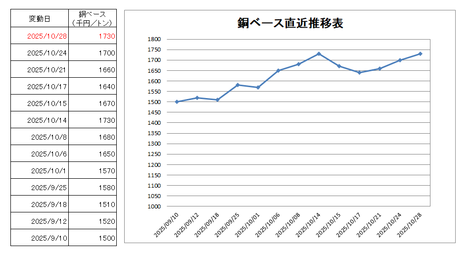 電設資材銅ベース 2025.10.28[ 電設資材銅ベース ] 1730千円/トン(3万円上げ) 10月28日(3万円上げ) 1700千円/トン(4万円上げ)[2025.10.24] お電話でのお問合せは各部門までお願い致します。 【営業時間】8:15 〜 17:45(土日祝は除く) メールでのお問合せ 営業所一覧