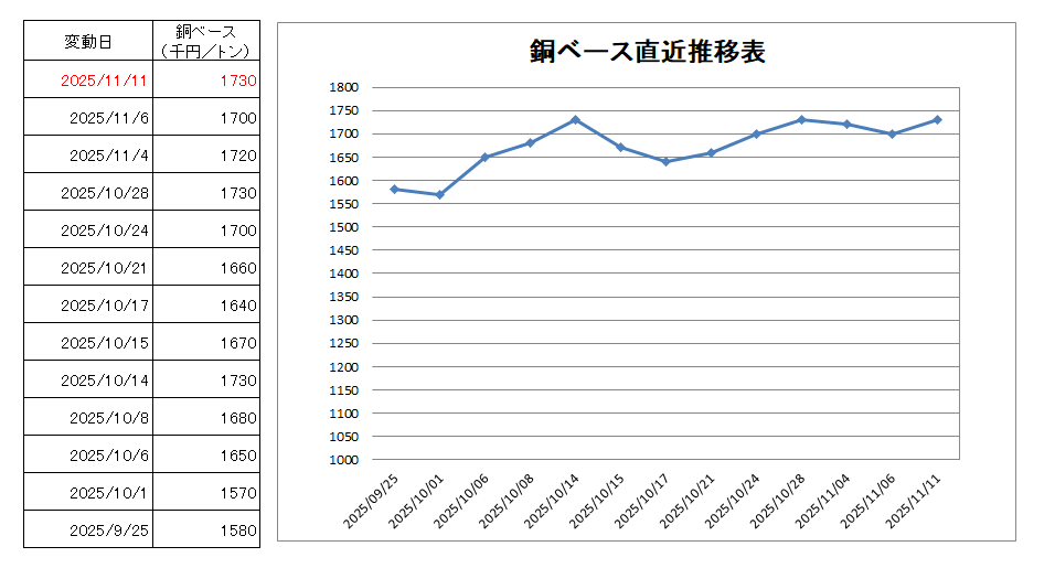 電設資材銅ベース 2025.11.11[ 電設資材銅ベース ] 1730千円/トン(3万円上げ) 11月11日(3万円上げ) 1700千円/トン(2万円下げ)[2025.11.06] お電話でのお問合せは各部門までお願い致します。 【営業時間】8:15 〜 17:45(土日祝は除く) メールでのお問合せ 営業所一覧